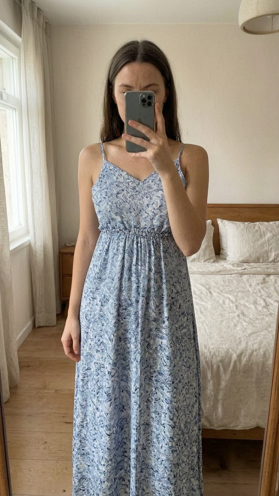 Robe longue d’été bleu et blanche S/M debout, face à la caméra, dans une chambre à la lumière douce, avec une lumière naturelle filtrant par la fenêtre.