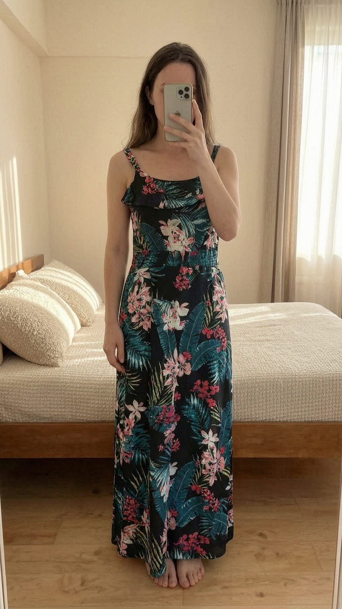Robe longue d'été Taille 34/36 debout, face à la caméra, dans une chambre à la lumière douce, avec une lumière naturelle filtrant par la fenêtre.