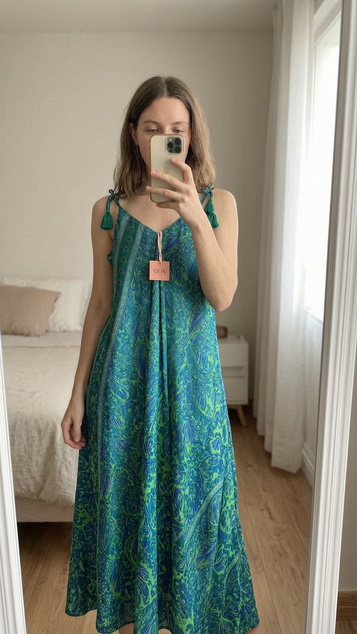 Robe longue GOA (neuve avec étiquette) debout, face à la caméra, dans une chambre à la lumière douce, avec une lumière naturelle filtrant par la fenêtre.
