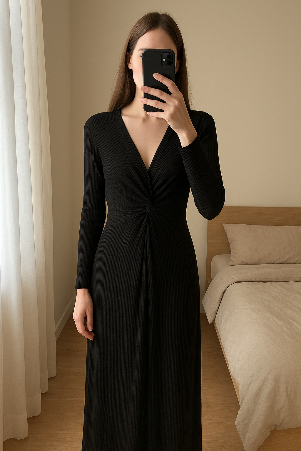 Robe longue noire debout, face à la caméra, dans une chambre à la lumière douce, avec une lumière naturelle filtrant par la fenêtre.