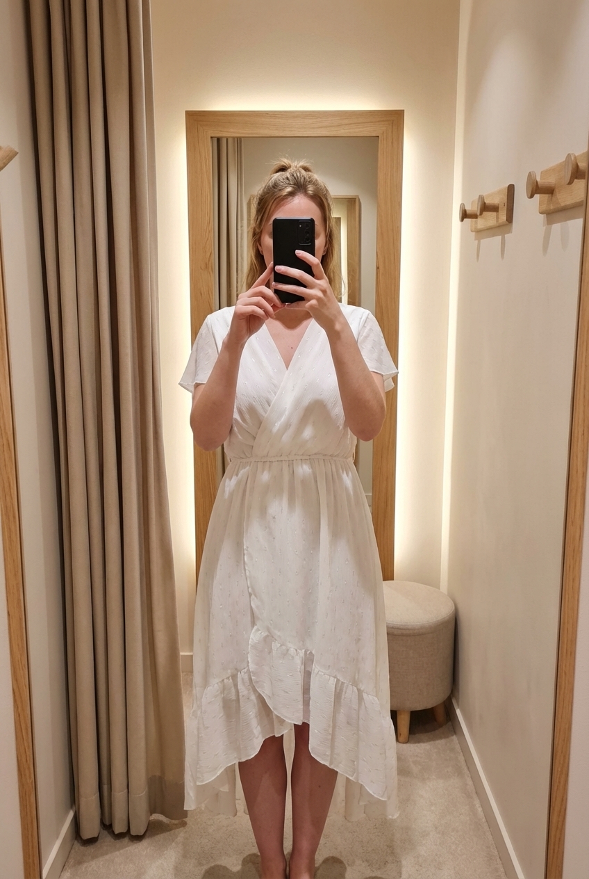 Une personne en Robe longue pour femme debout, face à la caméra, dans une cabine d’essayage de style boutique avec un miroir et une décoration neutre.