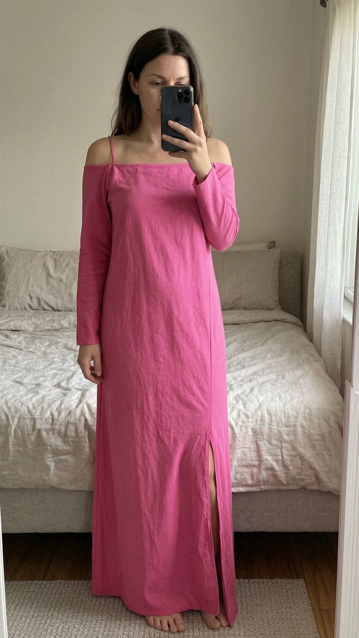 Robe longue rose Zara – dos nu – manches longues – fines bretelles – fente – taille M (38) debout, face à la caméra, dans une chambre à la lumière douce, avec une lumière naturelle filtrant par la fenêtre.