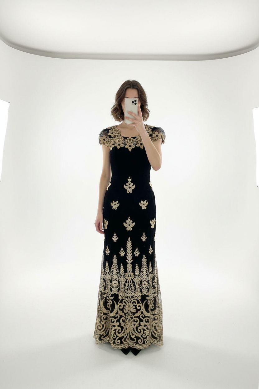 Une personne en Robe longue velours noir dentelle dorée fendue soirée standard 36/155cm debout, face à la caméra, dans un studio photo épuré avec fond blanc et éclairage doux.