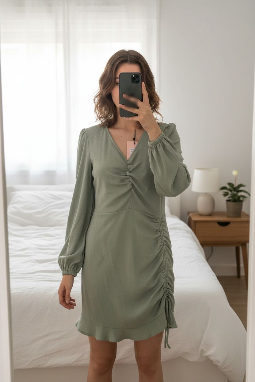 Robe longue verte réglable taille 40 debout, face à la caméra, dans une chambre à la lumière douce, avec une lumière naturelle filtrant par la fenêtre.