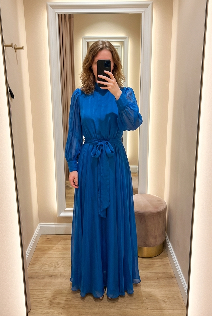 Une personne en Robe longue vintage debout, face à la caméra, dans une cabine d’essayage de style boutique avec un miroir et une décoration neutre.