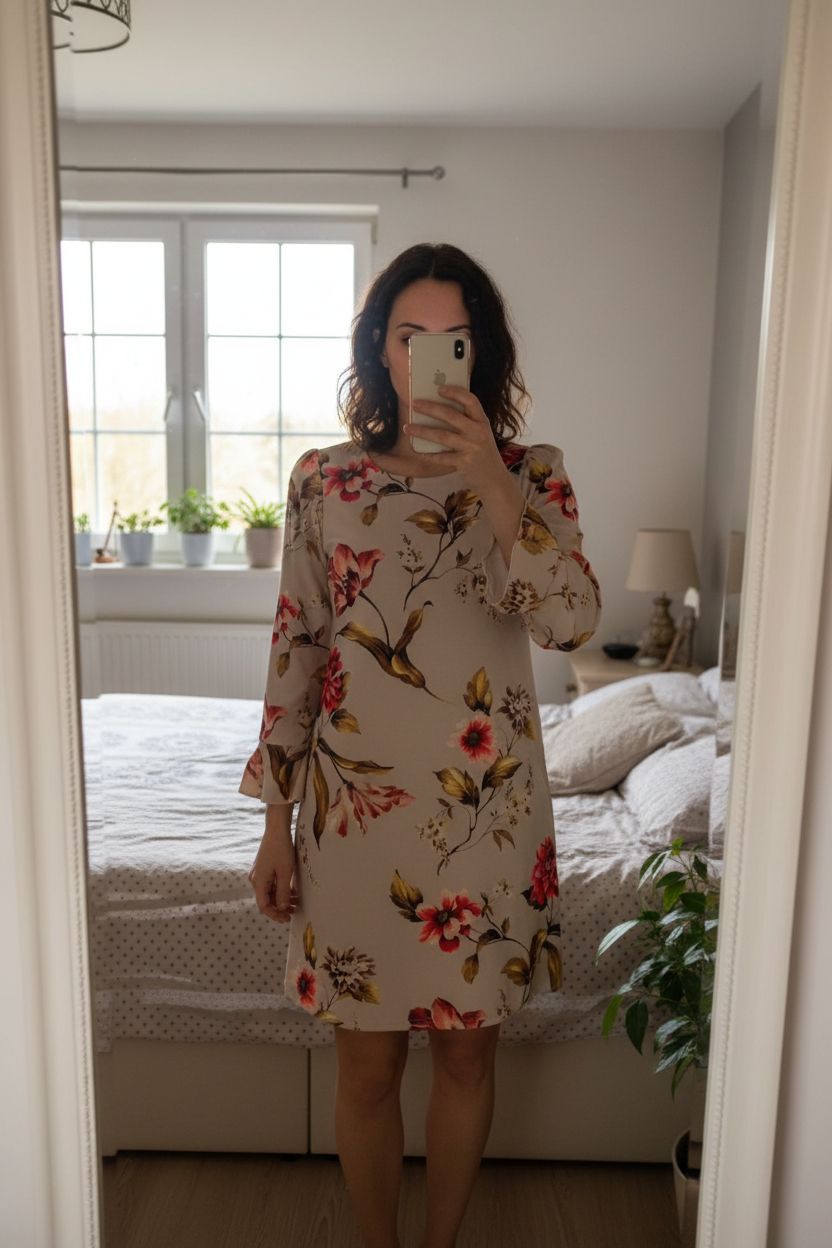 Une personne en Robe Lorell M debout, face à la caméra, dans une chambre à la lumière douce, avec une lumière naturelle filtrant par la fenêtre.