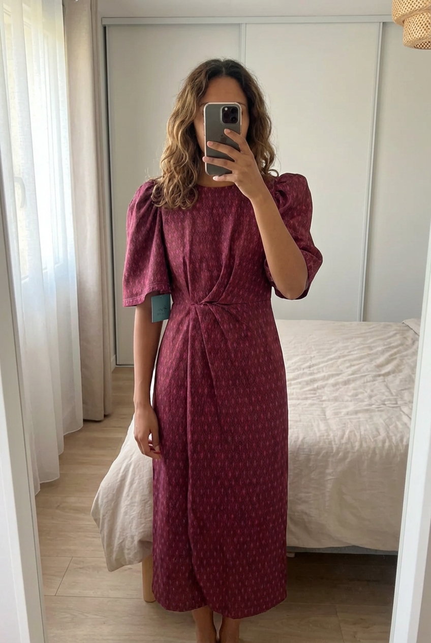 Une personne en Robe manches bouffantes bordeaux debout, face à la caméra, dans une chambre à la lumière douce, avec une lumière naturelle filtrant par la fenêtre.