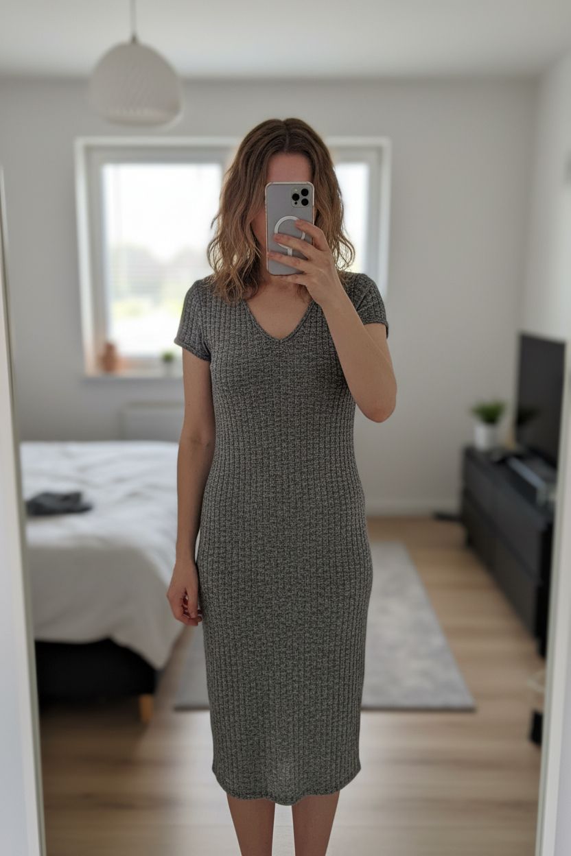 Robe manches courtes en maille taille M debout, face à la caméra, dans une chambre à la lumière douce, avec une lumière naturelle filtrant par la fenêtre.