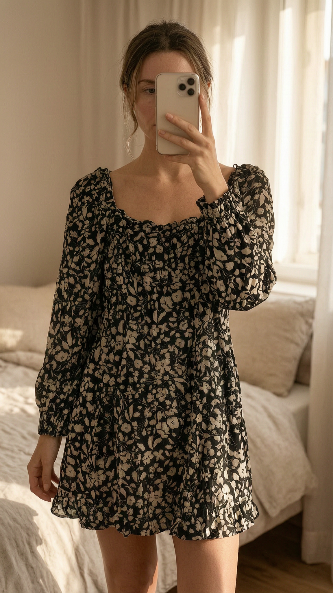 Robe mango / robe été / robe fleurie / robe courte / robe cocktail / robe cérémonie debout, face à la caméra, dans une chambre à la lumière douce, avec une lumière naturelle filtrant par la fenêtre.