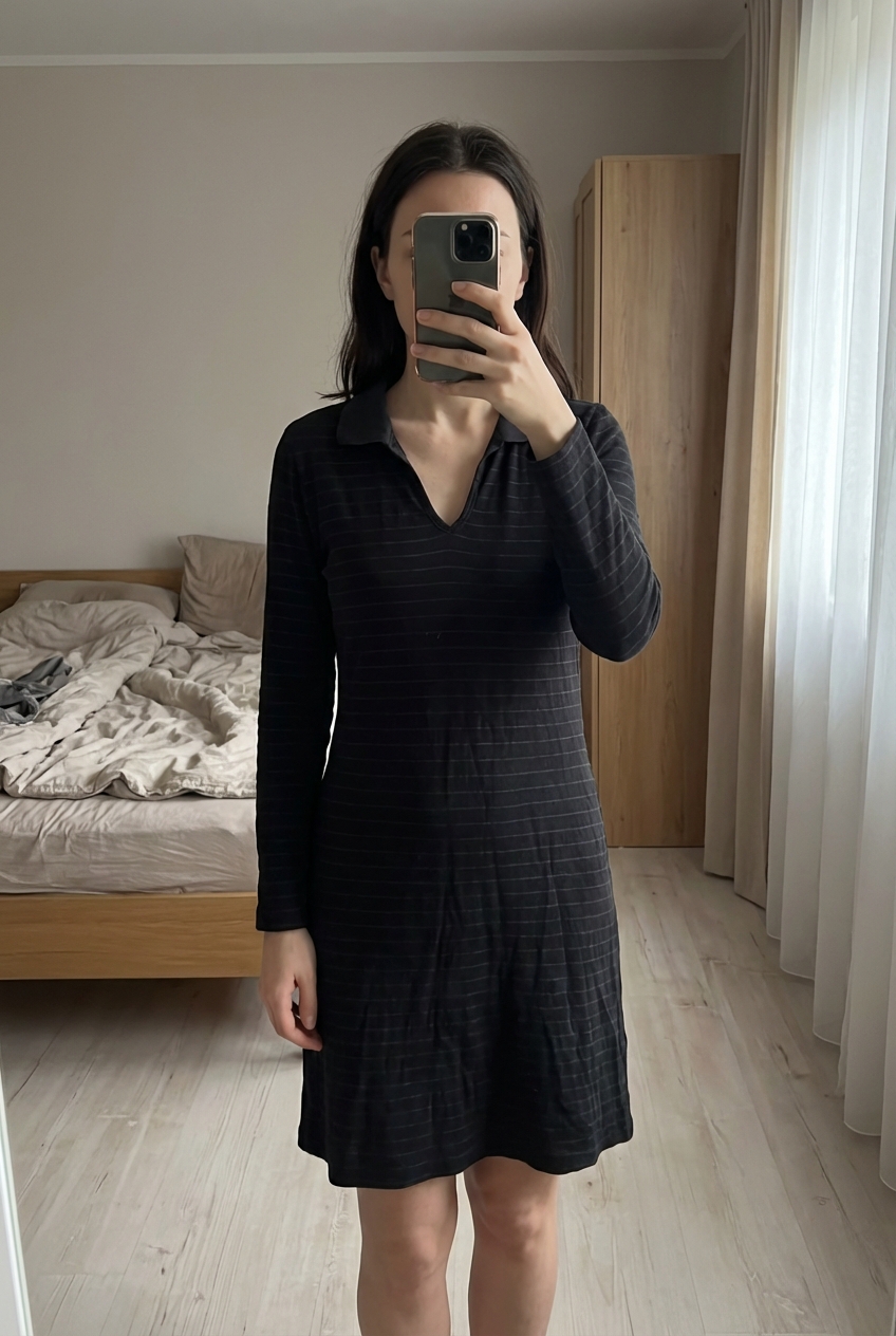 Robe mango taille M très bonne état debout, face à la caméra, dans une chambre à la lumière douce, avec une lumière naturelle filtrant par la fenêtre.