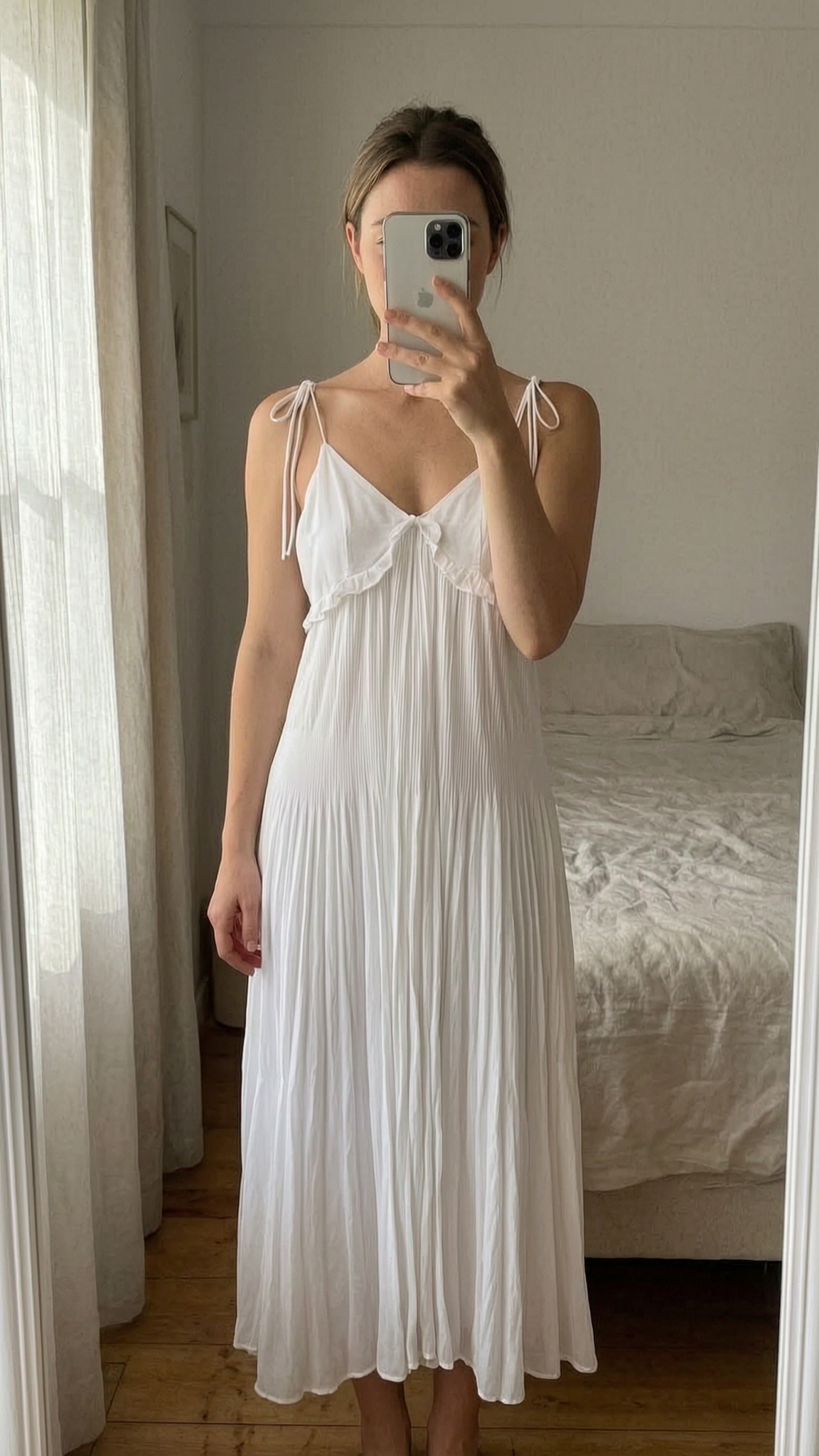 Robe mi longue blanche été S debout, face à la caméra, dans une chambre à la lumière douce, avec une lumière naturelle filtrant par la fenêtre.
