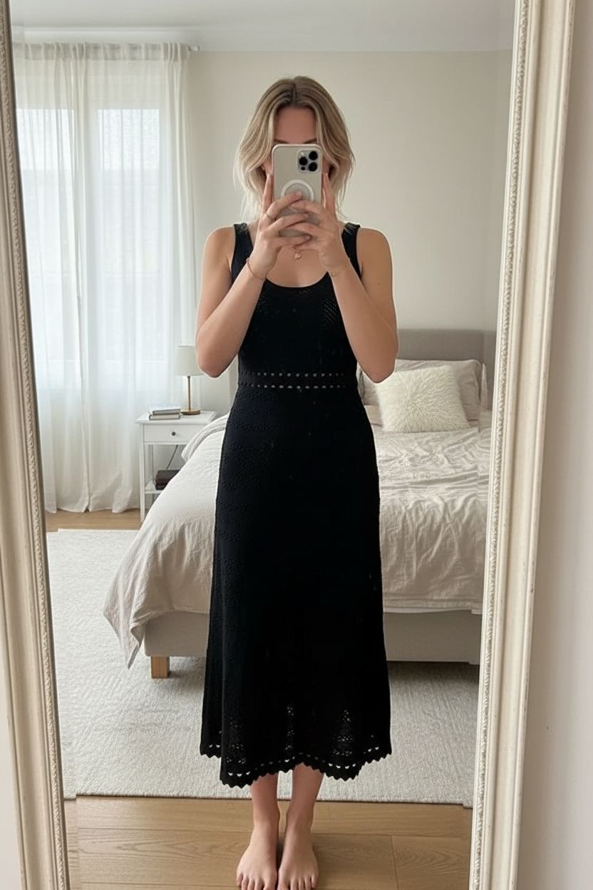 Une personne en Robe 👗 midi Claudie Pierlot maille noir T38 neuf debout, face à la caméra, avec une silhouette fine, dans une chambre à la lumière douce, avec une lumière naturelle filtrant par la fenêtre.