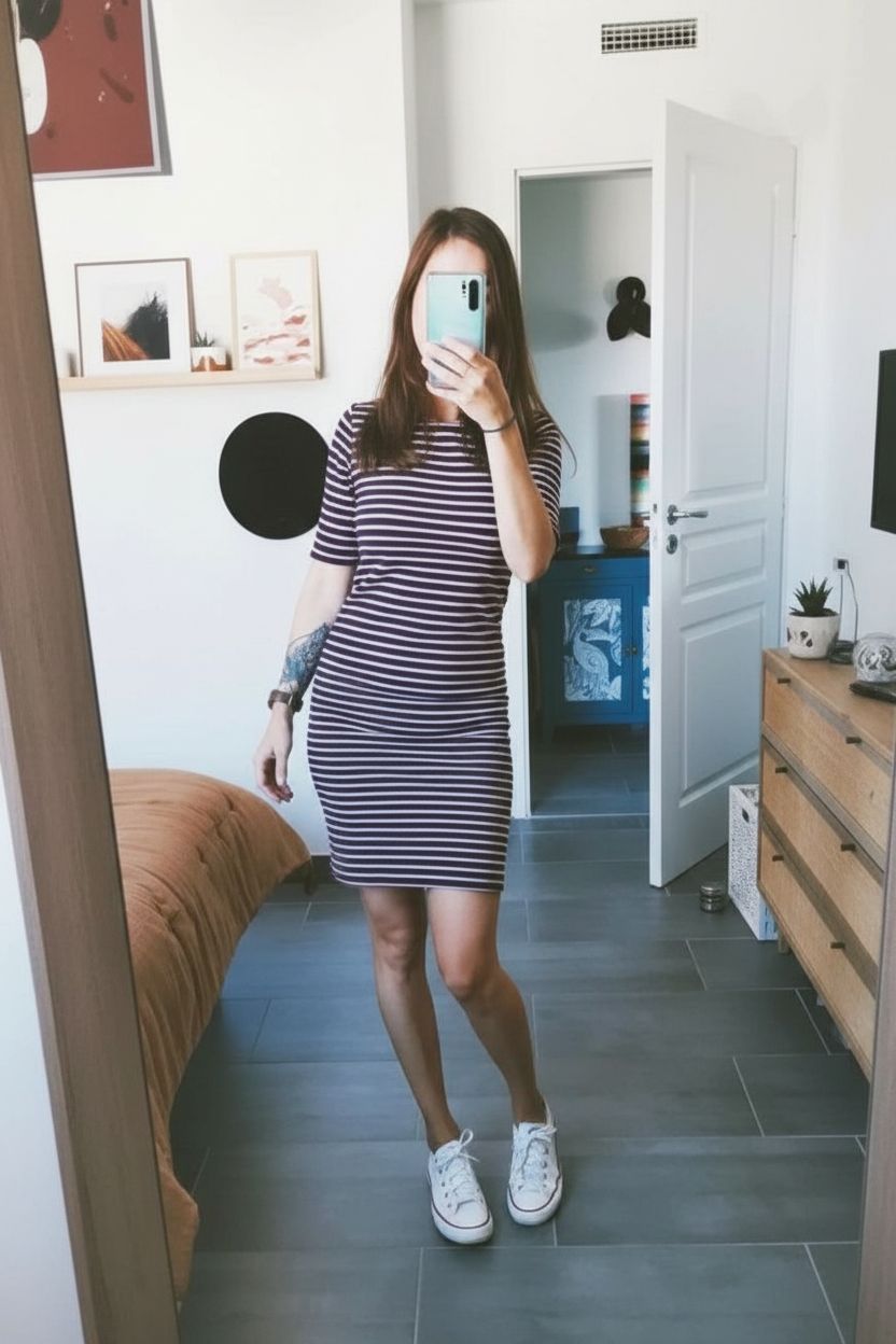 Une personne en Robe moulante "sport" Stradivarius cambrant légèrement le dos pour une pose dynamique, dans une chambre à la lumière douce, avec une lumière naturelle filtrant par la fenêtre.