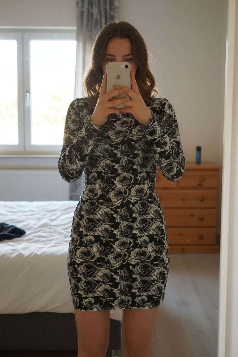 Robe moulante Tom Tailor taille S debout, face à la caméra, dans une chambre à la lumière douce, avec une lumière naturelle filtrant par la fenêtre.