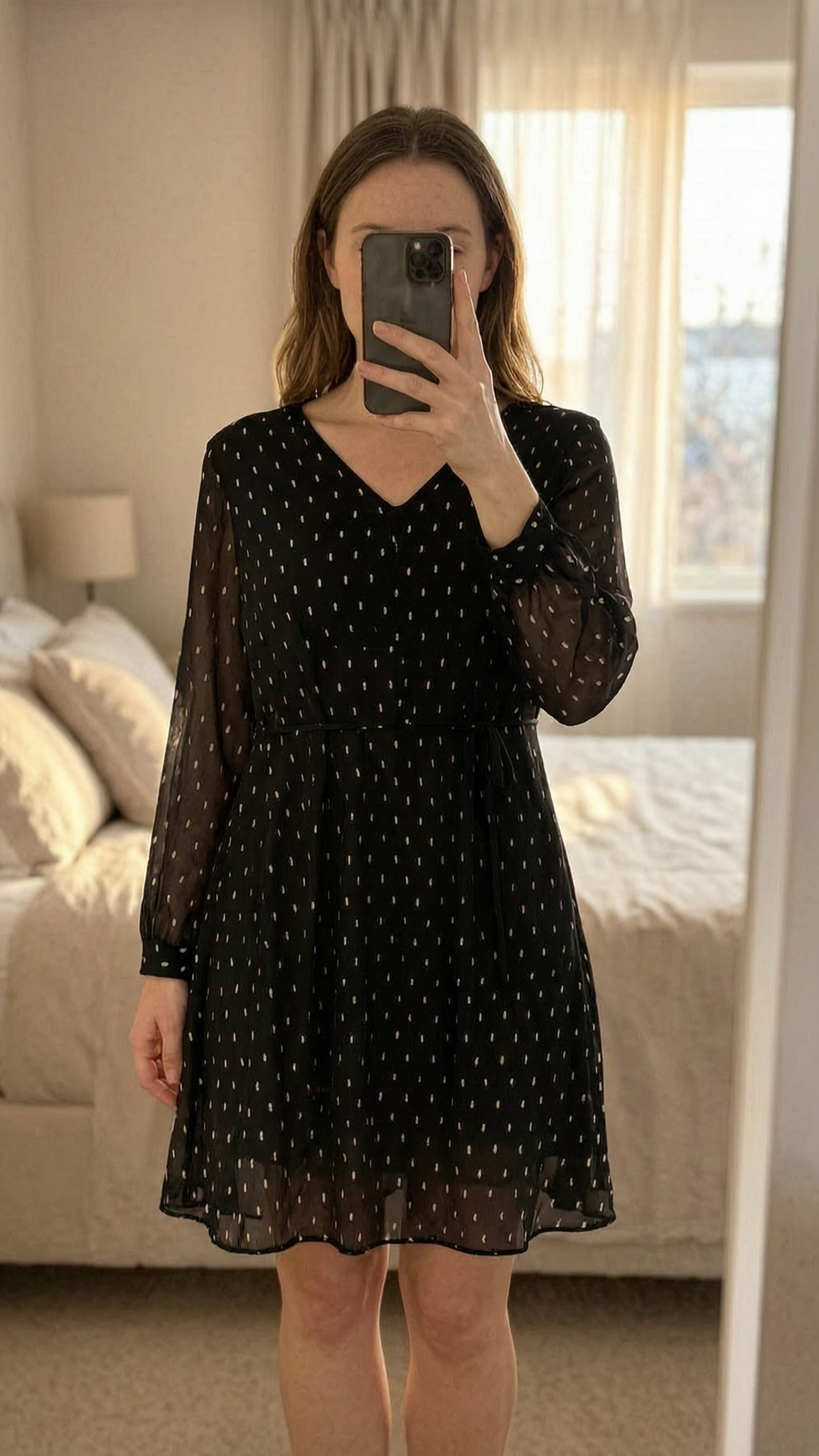 Robe noir debout, face à la caméra, dans une chambre à la lumière douce, avec une lumière naturelle filtrant par la fenêtre.