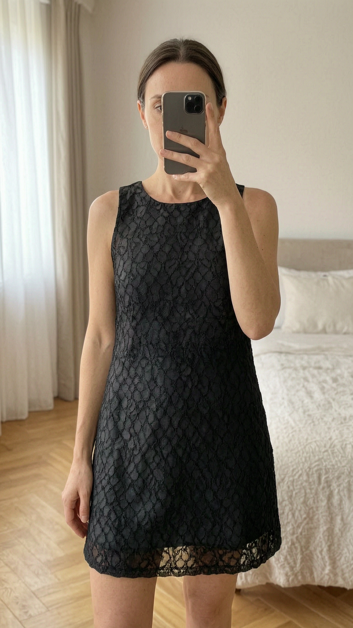 Robe noir dentelle Ciao Milano - L / 40 debout, face à la caméra, dans une chambre à la lumière douce, avec une lumière naturelle filtrant par la fenêtre.