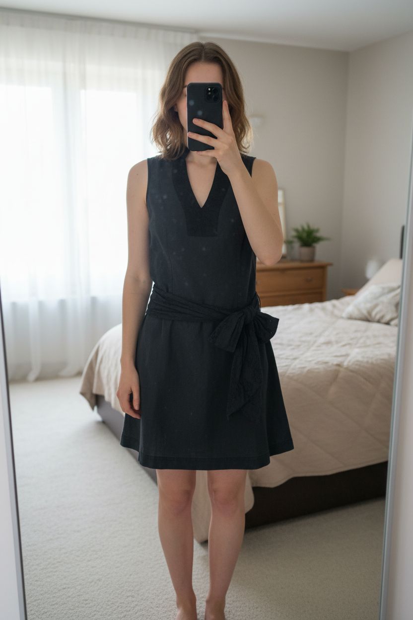 Robe noire avec ceinture T36 Promod en lin et coton debout, face à la caméra, dans une chambre à la lumière douce, avec une lumière naturelle filtrant par la fenêtre.