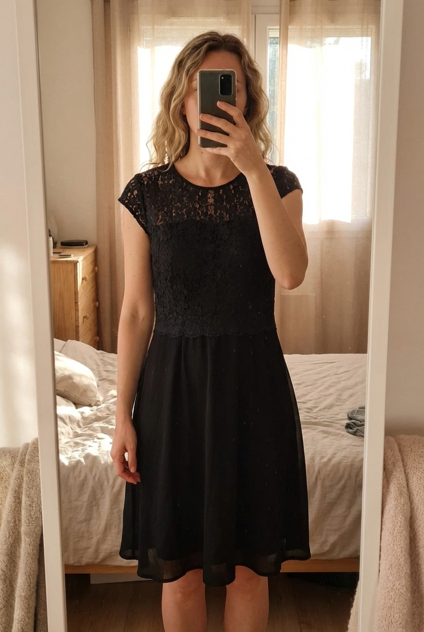 Une personne en Robe noire bustier dentelle neuve debout, face à la caméra, avec une silhouette légèrement plus ronde, dans une chambre à la lumière douce, avec une lumière naturelle filtrant par la fenêtre.