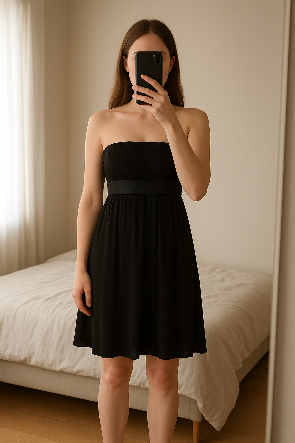 Robe noire bustier Link Donna – Taille S élégante debout, face à la caméra, dans une chambre à la lumière douce, avec une lumière naturelle filtrant par la fenêtre.