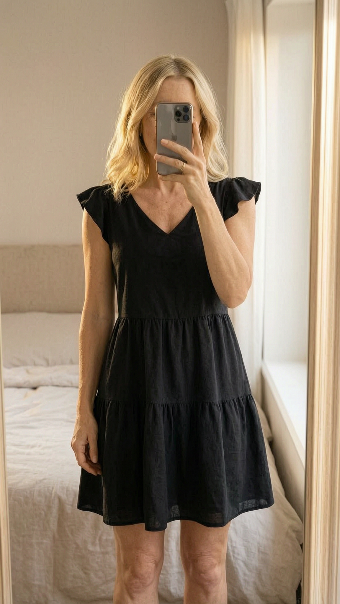 Robe noire fluide à volants –38/40-Lin/Coton- coupe féminine, style estival chic debout, face à la caméra, dans une chambre à la lumière douce, avec une lumière naturelle filtrant par la fenêtre.