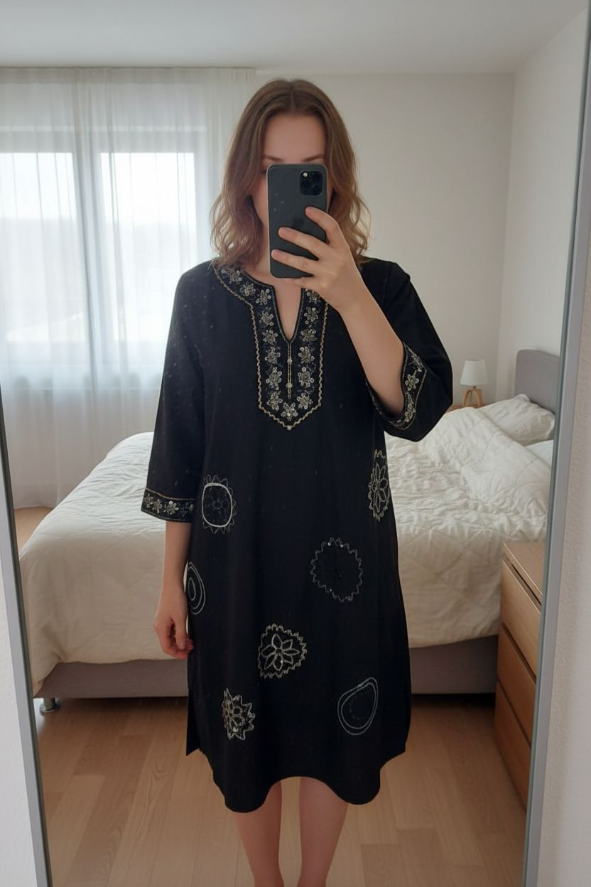 Robe noire soirée broderie sequin ethnique bohème taille S debout, face à la caméra, dans une chambre à la lumière douce, avec une lumière naturelle filtrant par la fenêtre.