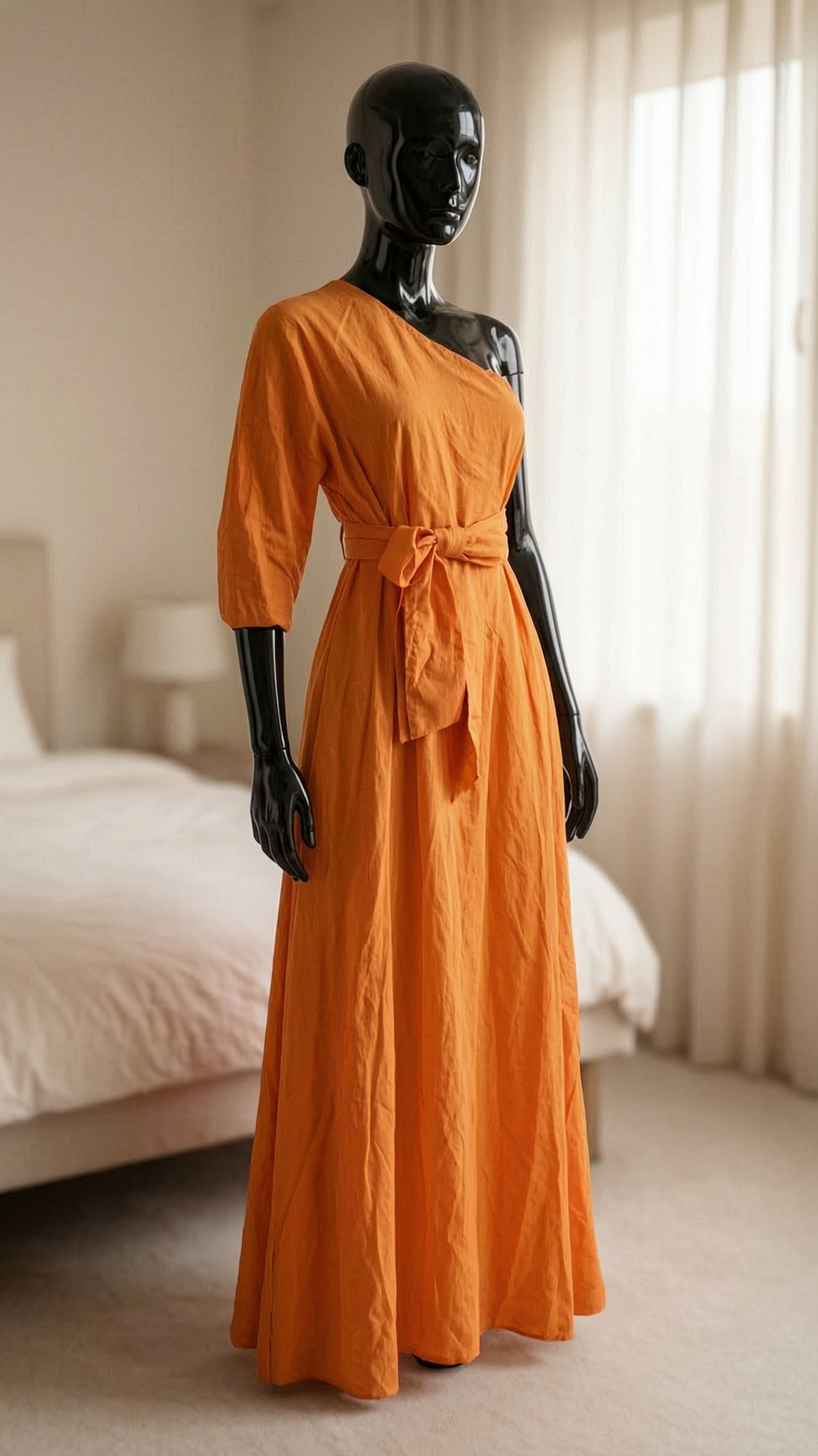 un mannequin noir brillant en plastique, sans traits du visage en Robe orange assimetrique cambrant légèrement le dos pour une pose dynamique, dans une chambre à la lumière douce, avec une lumière naturelle filtrant par la fenêtre.