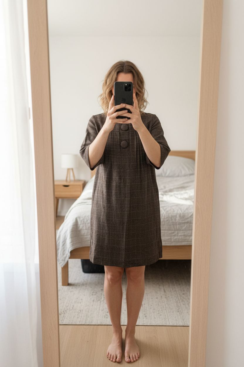 Robe épaisse à carreaux marron taille L debout, face à la caméra, dans une chambre à la lumière douce, avec une lumière naturelle filtrant par la fenêtre.