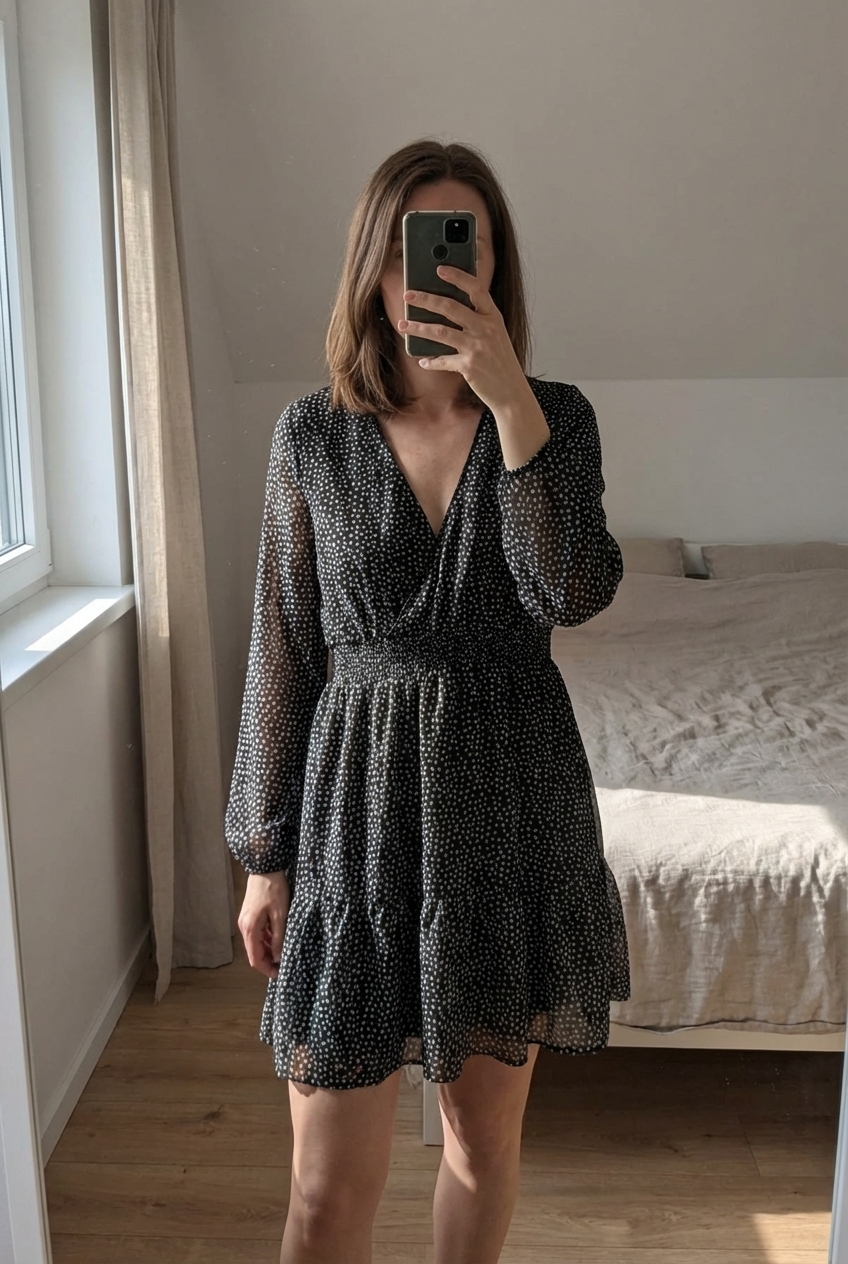 Robe à pois debout, face à la caméra, dans une chambre à la lumière douce, avec une lumière naturelle filtrant par la fenêtre.