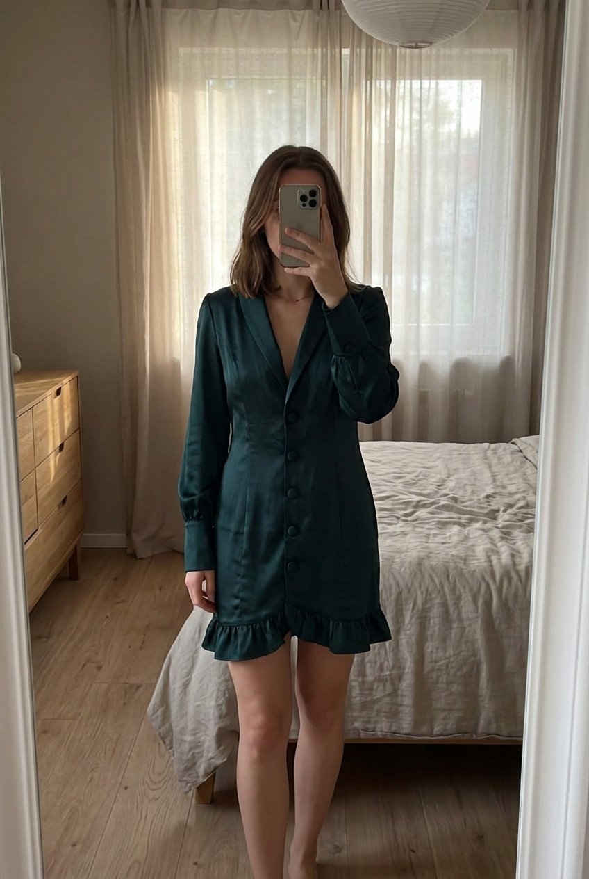 Robe PrettyLittleThing taille M très bonne état debout, face à la caméra, dans une chambre à la lumière douce, avec une lumière naturelle filtrant par la fenêtre.
