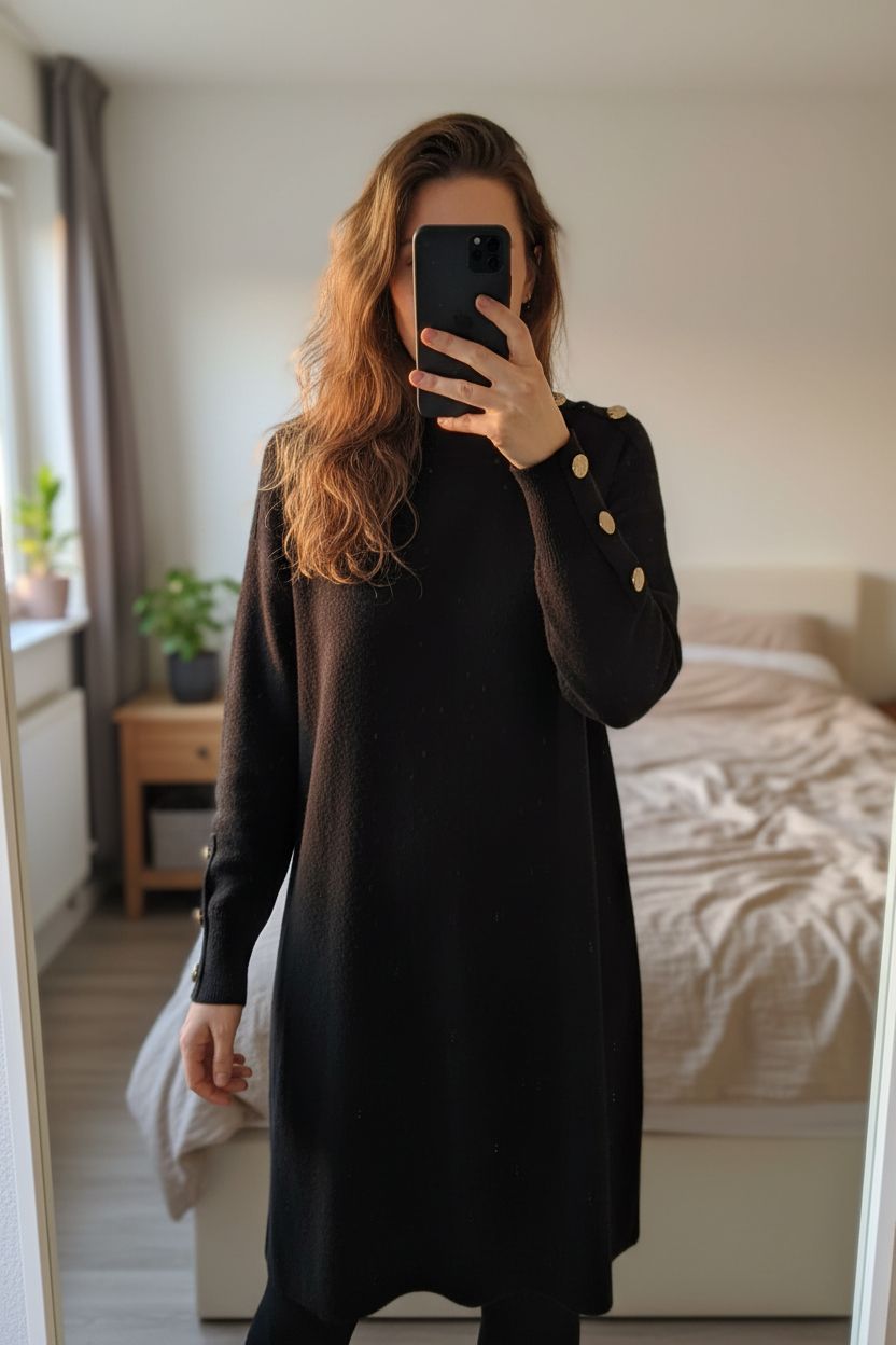 Robe pull noir debout, face à la caméra, dans une chambre à la lumière douce, avec une lumière naturelle filtrant par la fenêtre.