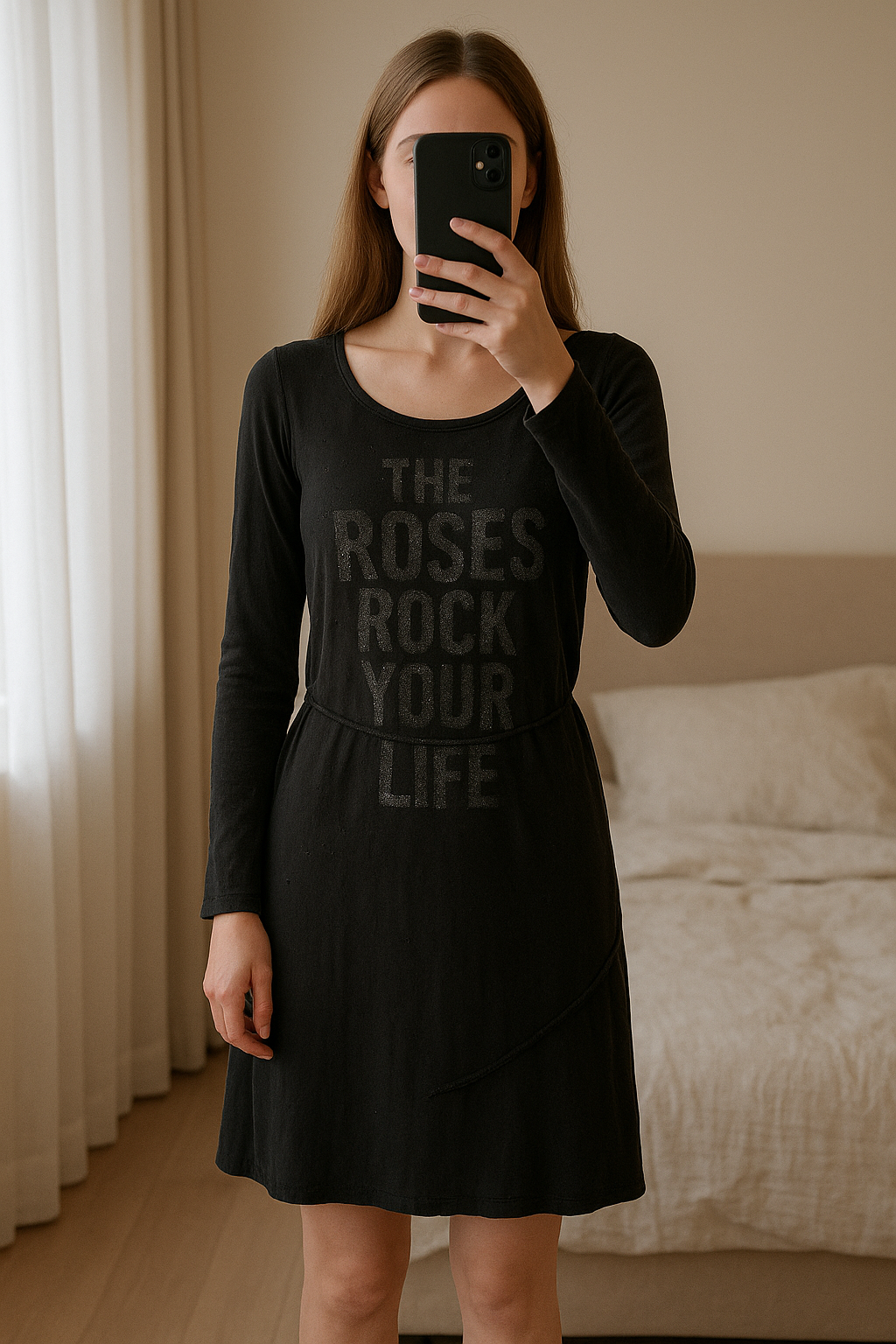 Robe rock debout, face à la caméra, dans une chambre à la lumière douce, avec une lumière naturelle filtrant par la fenêtre.