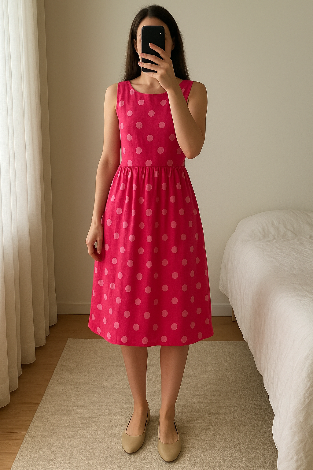 Robe rose a poid debout, face à la caméra, dans une chambre à la lumière douce, avec une lumière naturelle filtrant par la fenêtre.