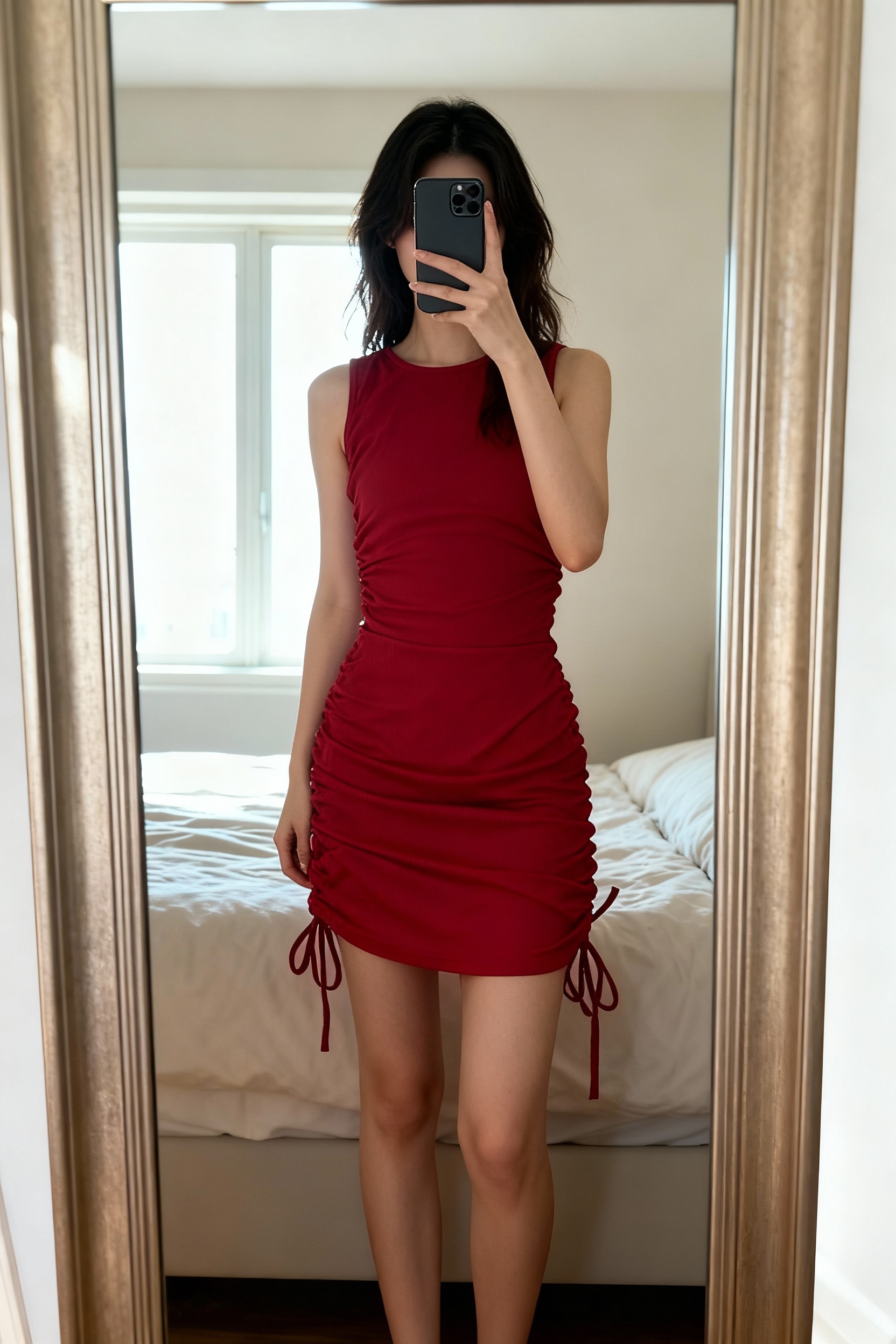Robe rouge debout, face à la caméra, dans une chambre à la lumière douce, avec une lumière naturelle filtrant par la fenêtre.