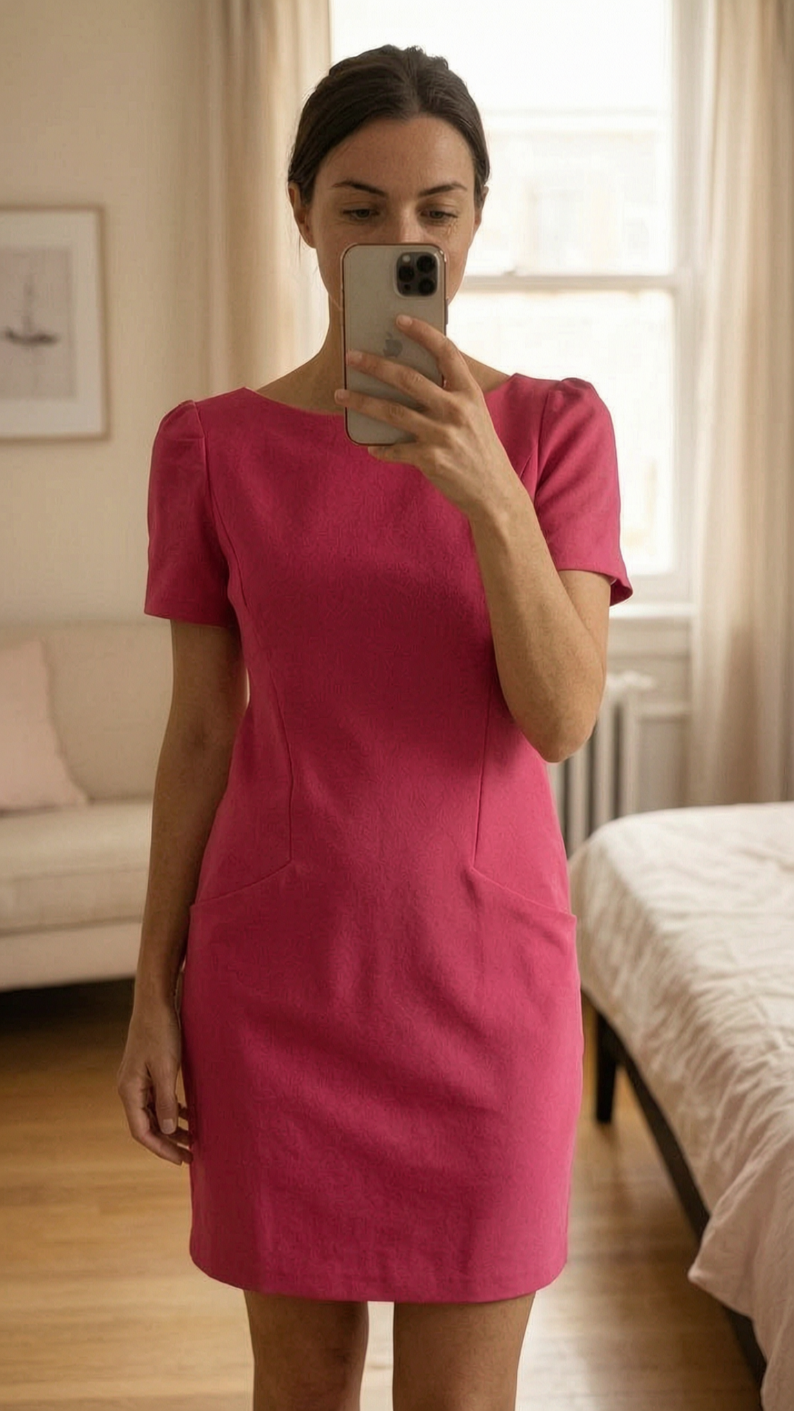 Une personne en Robe rouge framboise Promod taille 36 debout, face à la caméra, avec une silhouette fine, dans une chambre à la lumière douce, avec une lumière naturelle filtrant par la fenêtre.