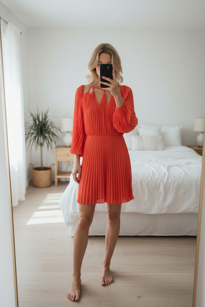 Une personne en Robe Sandro plissée corail Noelia T36 neuf debout, face à la caméra, avec une silhouette fine, dans une chambre à la lumière douce, avec une lumière naturelle filtrant par la fenêtre.