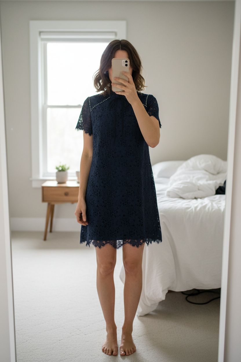 Robe Sandro taille 38 debout, face à la caméra, dans une chambre à la lumière douce, avec une lumière naturelle filtrant par la fenêtre.
