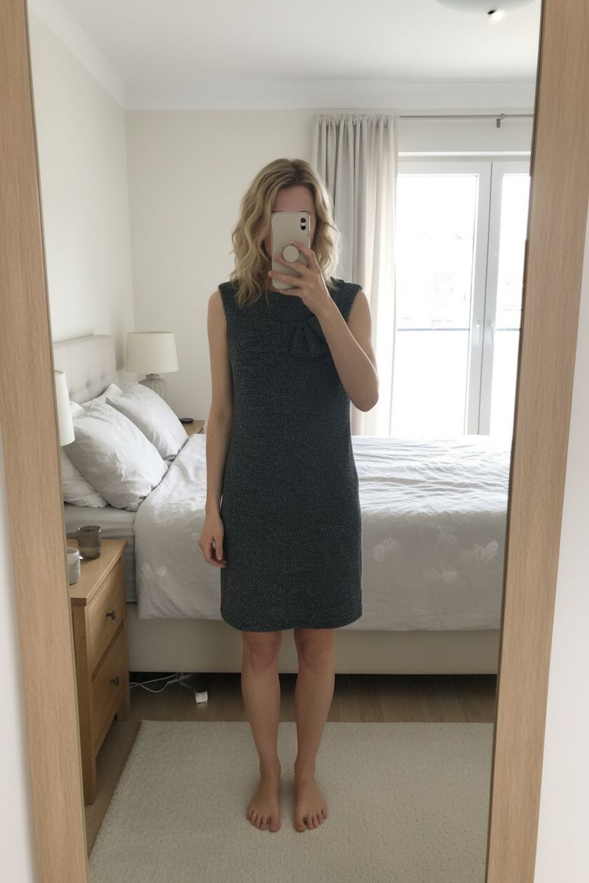 Robe sans manche taille M debout, face à la caméra, dans une chambre à la lumière douce, avec une lumière naturelle filtrant par la fenêtre.