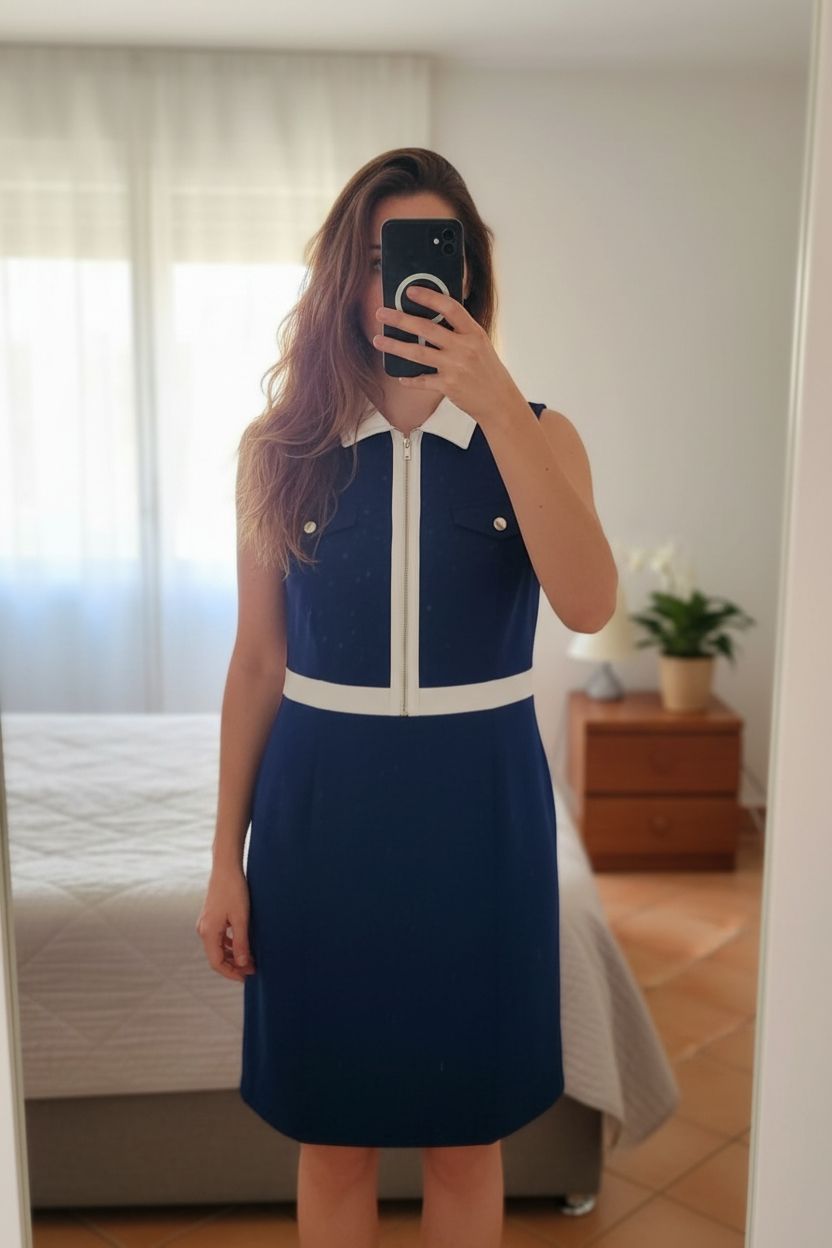 Robe sans manches debout, face à la caméra, dans une chambre à la lumière douce, avec une lumière naturelle filtrant par la fenêtre.