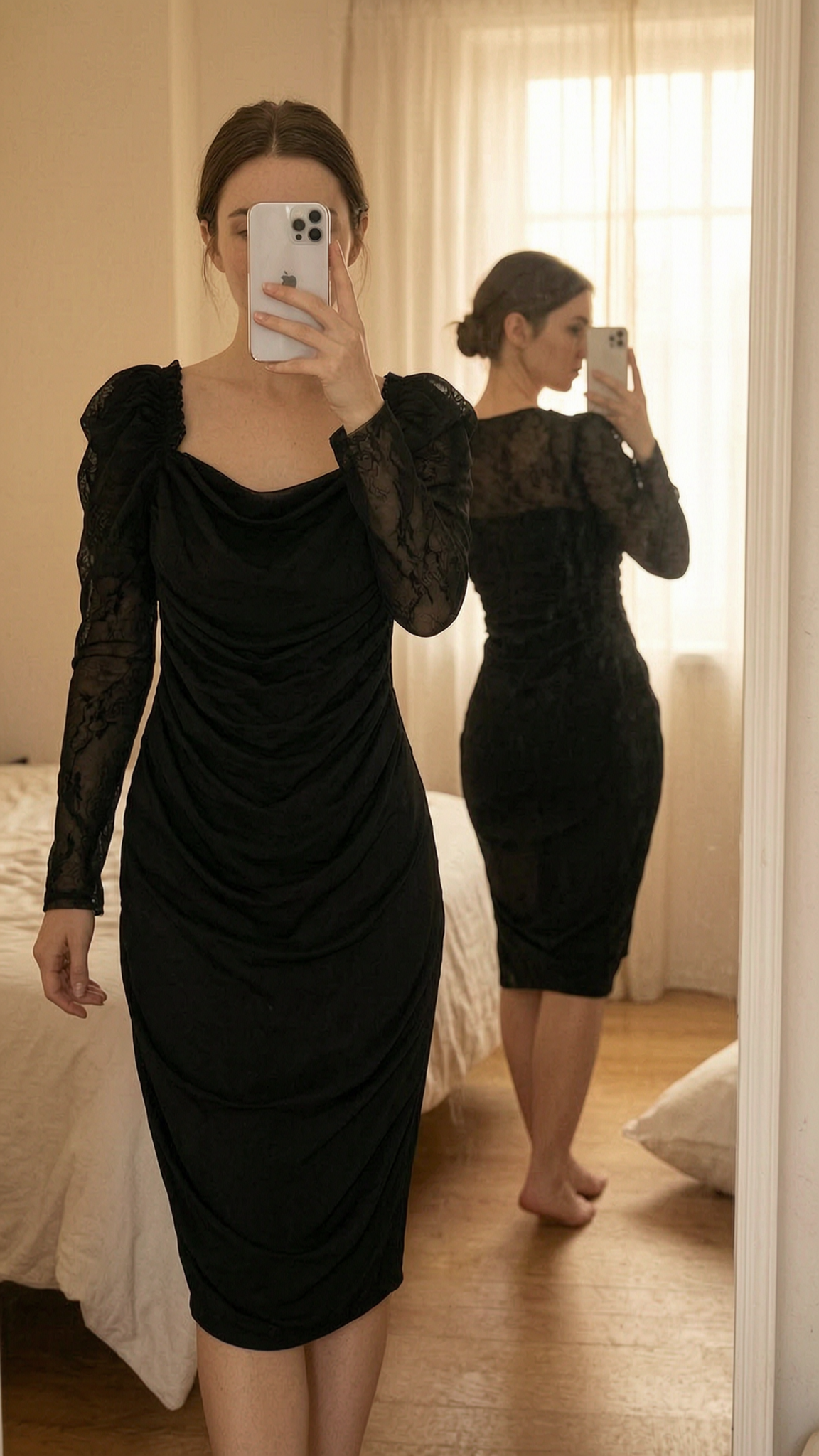 Robe shein taille 38 debout, face à la caméra, dans une chambre à la lumière douce, avec une lumière naturelle filtrant par la fenêtre.