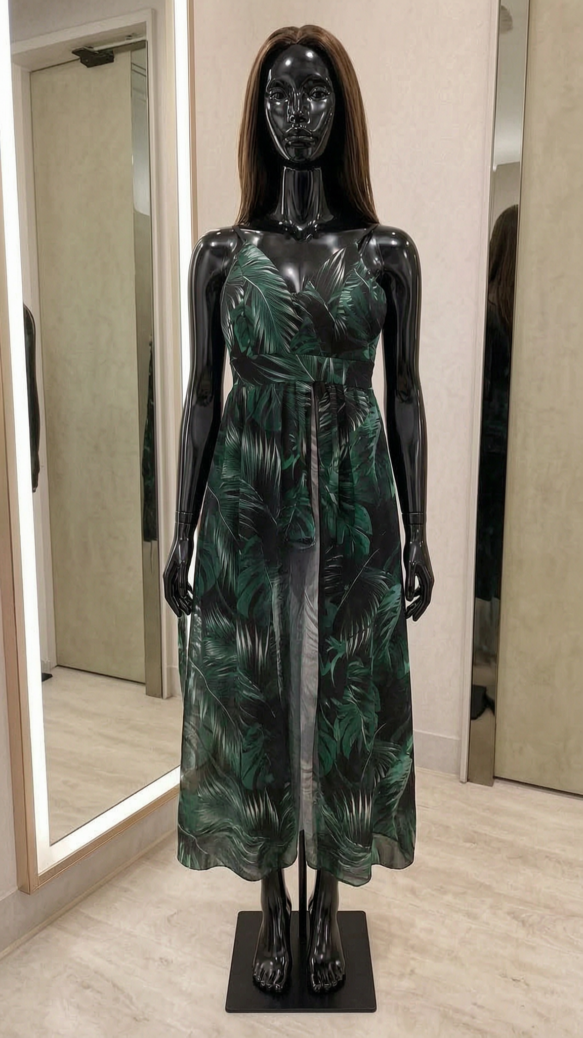 un mannequin noir brillant en plastique, sans traits du visage en Robe short, feuillage, style Boho, taille 38/40, Marque New Collection cambrant légèrement le dos pour une pose dynamique, avec une silhouette légèrement plus ronde, dans une cabine d’essayage de style boutique avec un miroir et une décoration neutre.