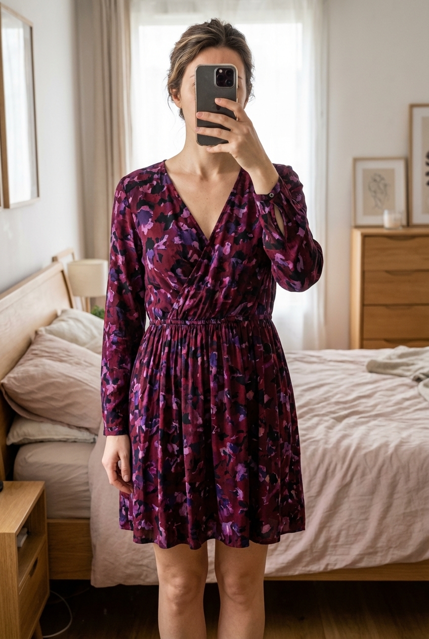 Robe Sud express taille M debout, face à la caméra, dans une chambre à la lumière douce, avec une lumière naturelle filtrant par la fenêtre.