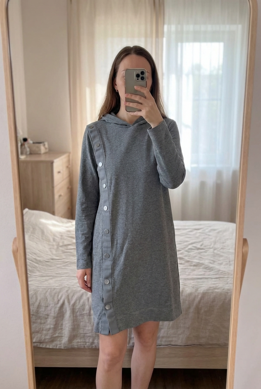 Robe sweat lotriand debout, face à la caméra, dans une chambre à la lumière douce, avec une lumière naturelle filtrant par la fenêtre.