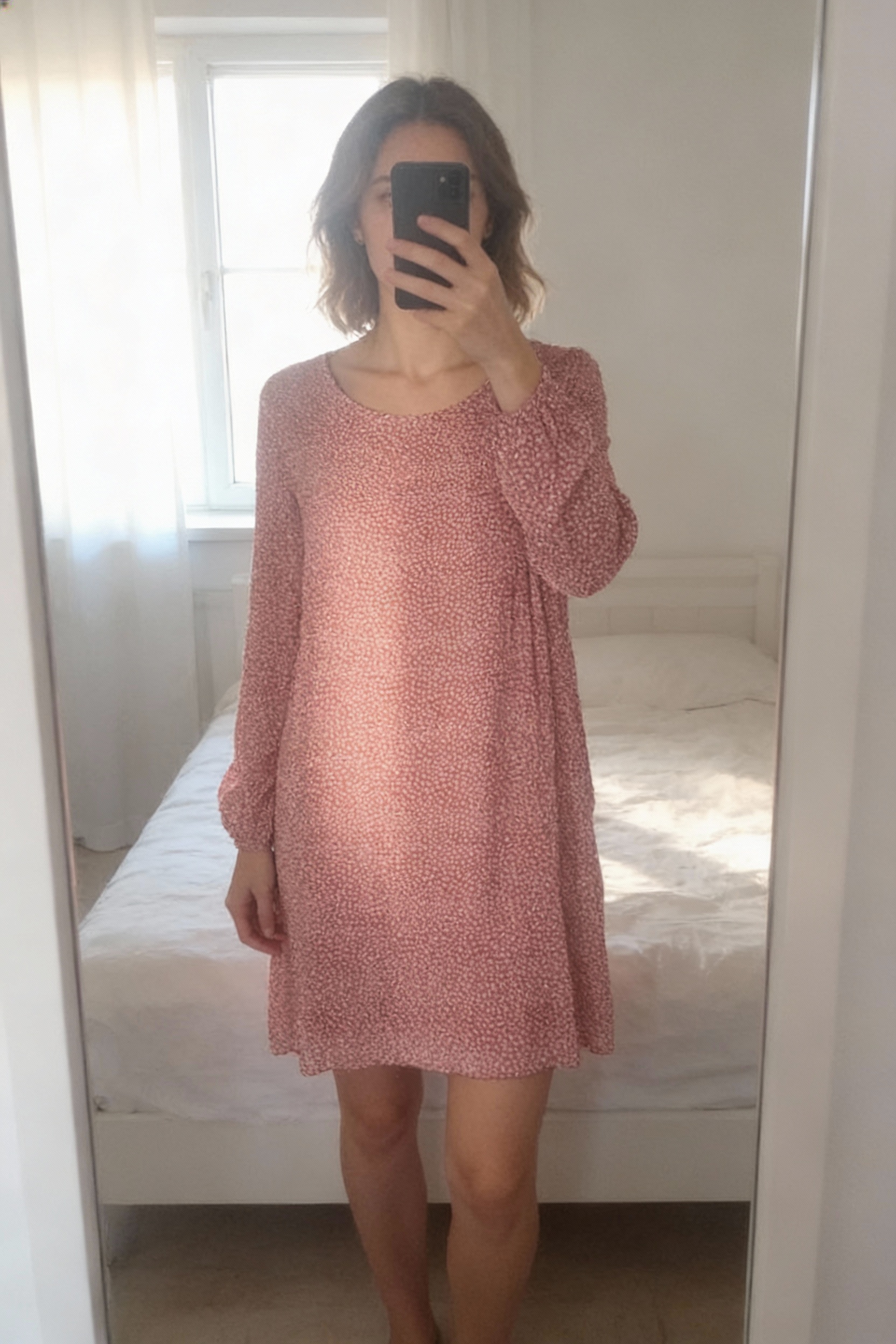 Robe T 42/44 debout, face à la caméra, dans une chambre à la lumière douce, avec une lumière naturelle filtrant par la fenêtre.