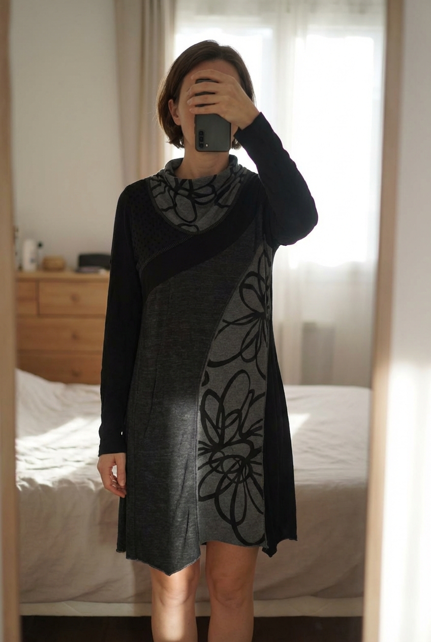 Robe T42/44 debout, face à la caméra, dans une chambre à la lumière douce, avec une lumière naturelle filtrant par la fenêtre.
