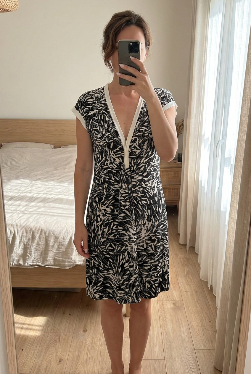 Robe taille l debout, face à la caméra, dans une chambre à la lumière douce, avec une lumière naturelle filtrant par la fenêtre.