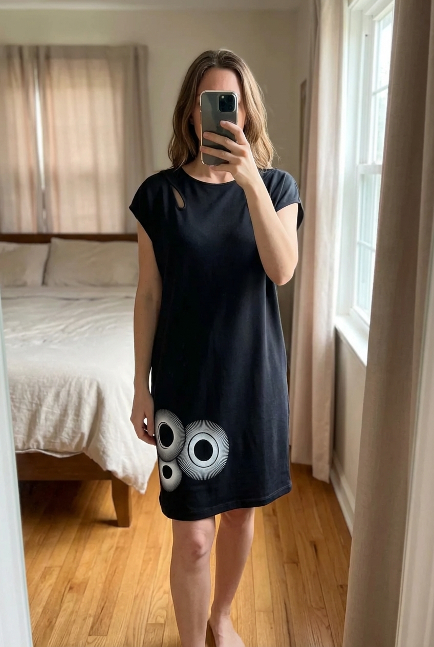 Robe ulnac debout, face à la caméra, dans une chambre à la lumière douce, avec une lumière naturelle filtrant par la fenêtre.
