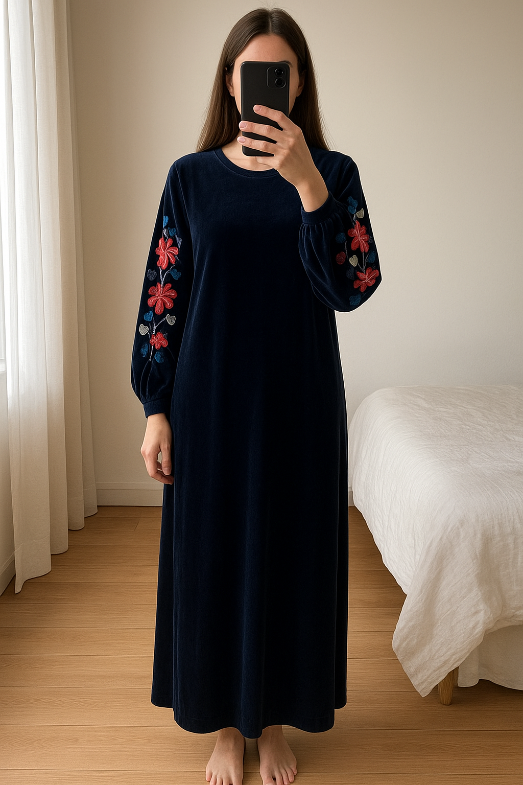 Robe velour debout, face à la caméra, dans une chambre à la lumière douce, avec une lumière naturelle filtrant par la fenêtre.