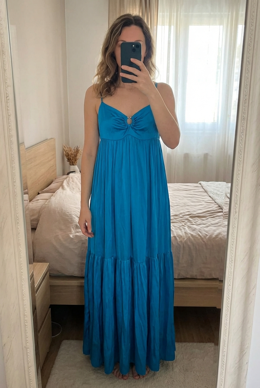 Robe Zara bleu satinee debout, face à la caméra, dans une chambre à la lumière douce, avec une lumière naturelle filtrant par la fenêtre.