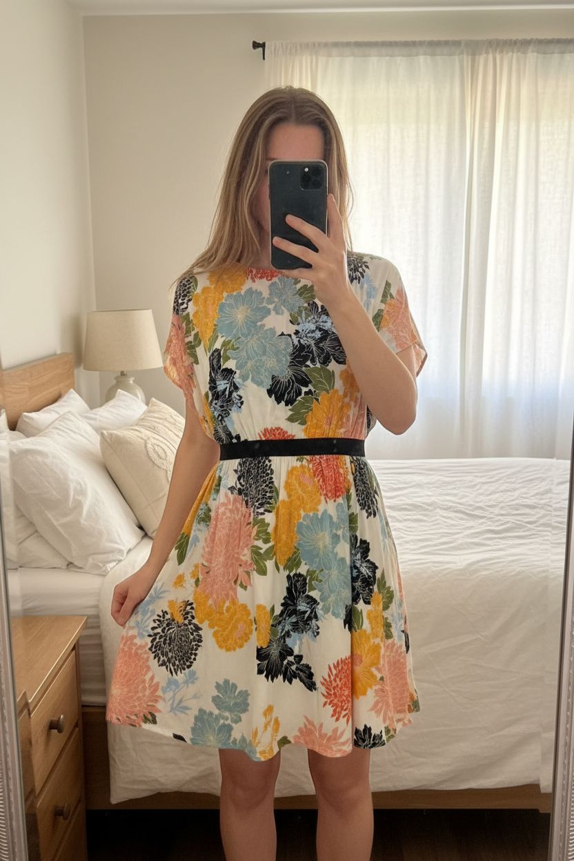Robe Zara d’été debout, face à la caméra, dans une chambre à la lumière douce, avec une lumière naturelle filtrant par la fenêtre.