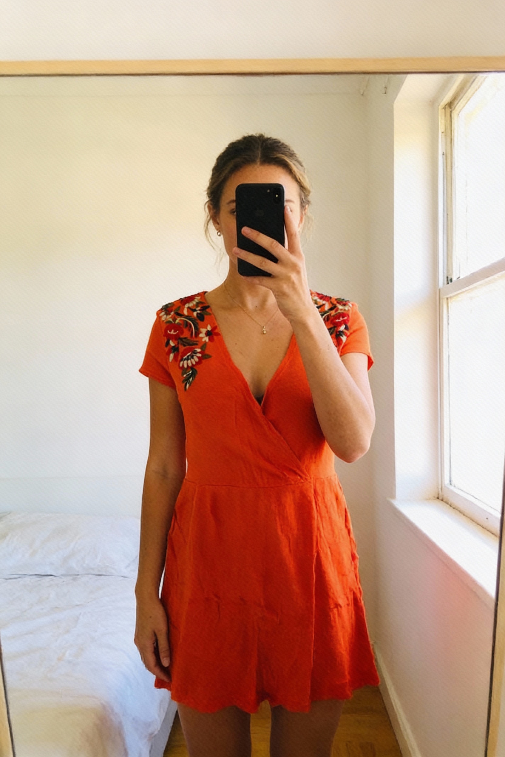Robe Zara orange à fleurs debout, face à la caméra, dans une chambre à la lumière douce, avec une lumière naturelle filtrant par la fenêtre.